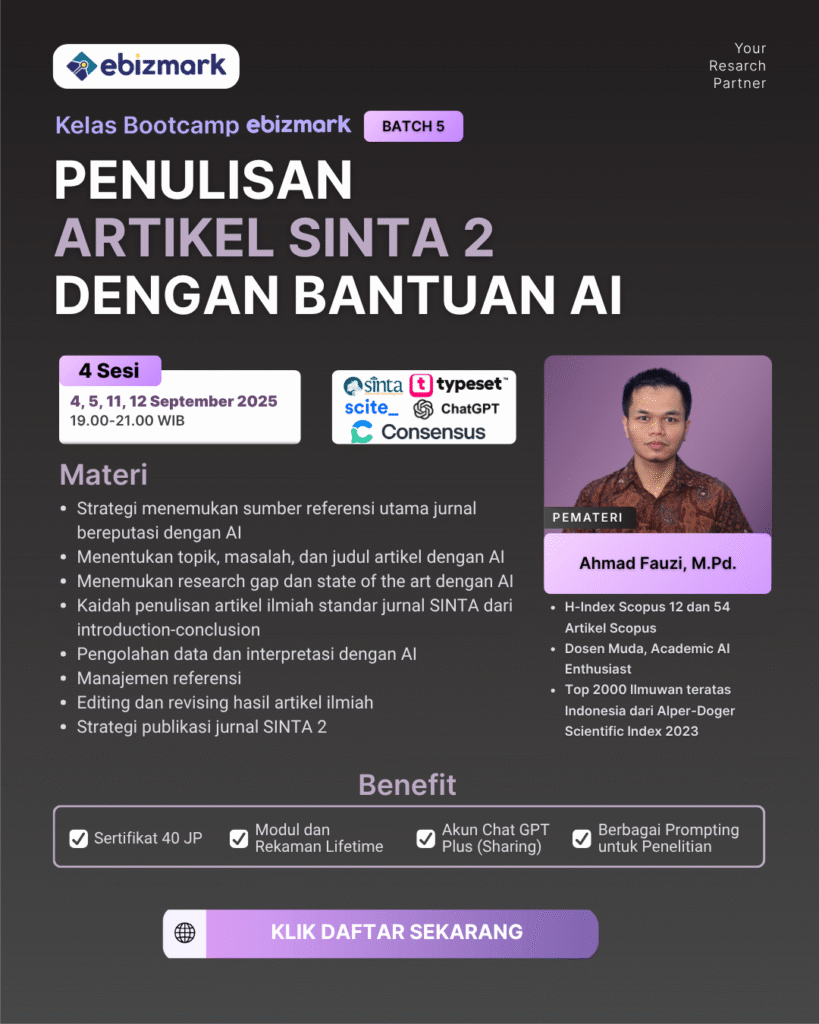 Belajar penulisan artikel ilmiah menggunakan alat bantu Artificial Intelegence (AI) untuk publikasi Sinta selama 5 minggu bersama ahlinya.