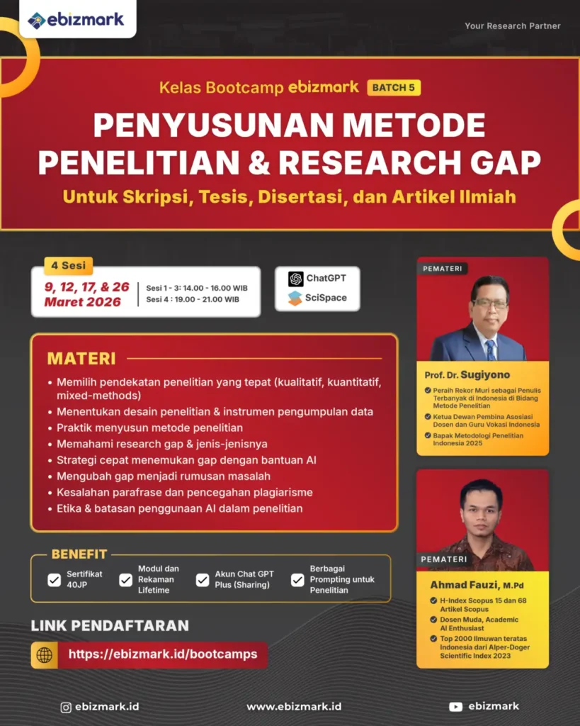 Kesulitan dalam menyusun metode penelitian dan menemukan research gap? Bootcamp ini akan membekali Anda dengan keterampilan memilih pendekatan penelitian yang tepat, menyusun desain penelitian, serta menggunakan AI untuk mengidentifikasi dan mengatasi research gap.